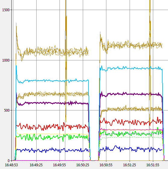 The width of the two charts shows the relative time taken for the test (5000 connections sending 500 x 1024 byte messages) to complete. The brown squiggles are thread context switches per second. Red is % processor time (8 cores, so 800 is 100% CPU), Green is kernel time, Dark Blue is user time. The thick purple line is Total Bytes/sec through the network interface. Light blue is I/O pool events per second. All counters are scaled to fit and the scaling and relative widths of the charts remain constant over the next charts…