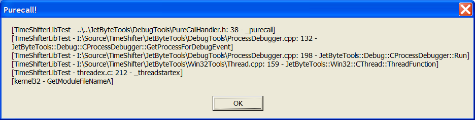 Unfortunately, the “retry” button often doesn’t end up with me in the debugger solving the problem. Luckilly it’s easy to replace the standard implementation of purecall with your own. Simply provide a function with this signature int __cdecl _purecall(void) and link with it before you link with the CRT. This usually just means adding this function to your code somewhere, such as in the same file as main() which will cause the linker to find it before it finds the standard one. Once you do this you can take control over what happens when a purecall situation arises. I decided to take a snapshot of the call stack and display that: