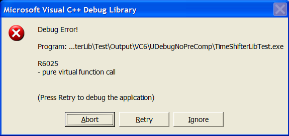 The runtime library implementation of purecall displays “R6025 - pure virtual function call” to the console or pops up the following dialog box